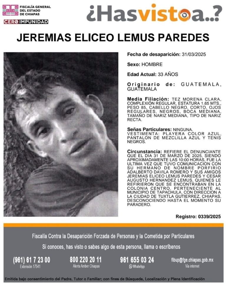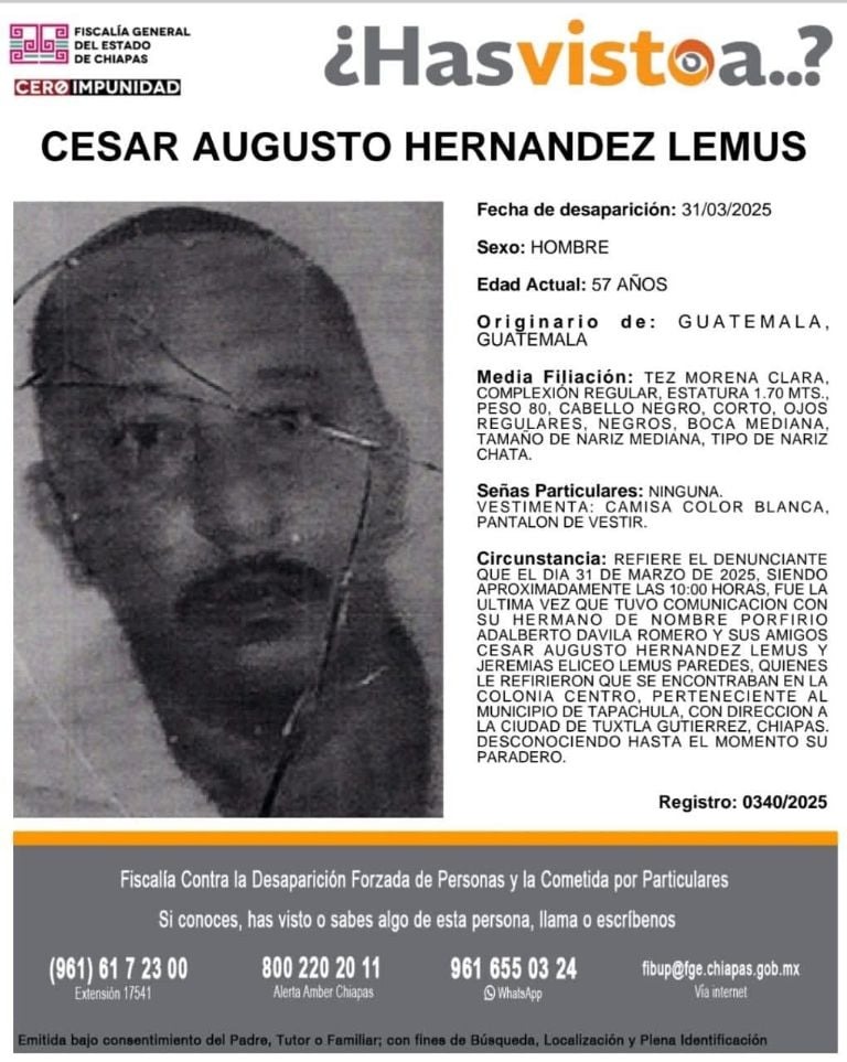 La Fiscalía General del Estado de Chiapas emitió las fichas de búsqueda correspondientes a través del programa “¿Has visto a…?”.
