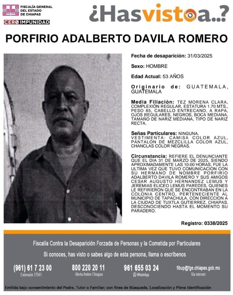 Las fichas de desaparición emitidas corresponden a los números 0338/2025 para Porfirio Adalberto Dávila Romero, 0339/2025 para Jeremías Eliceo Lemus Paredes, y 0340/2025 para César Augusto Hernández Lemus.